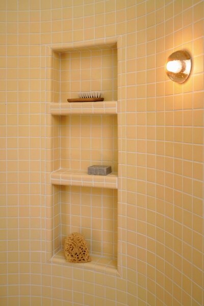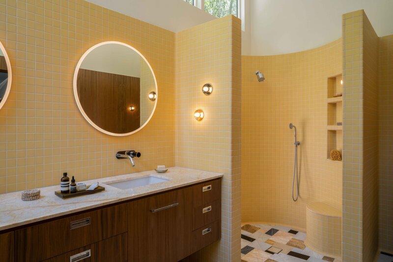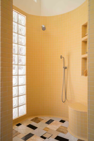 The walls and shower are clad in a buttery yellow porcelain sheet mosaic -