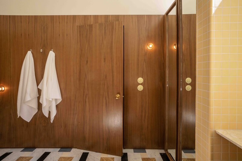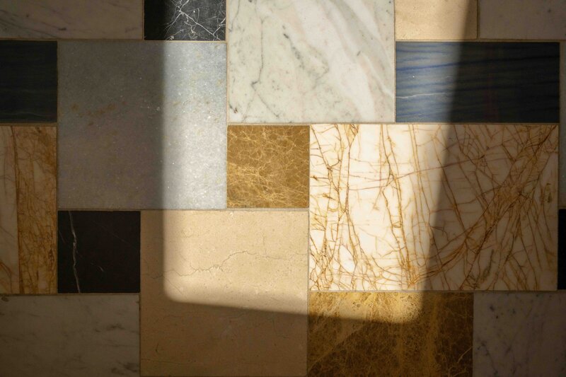 The walls and shower are clad in a buttery yellow porcelain sheet mosaic - a simple, classic offering from an architectural tile supplier. The floors, however, were a labor of love and required meticulous sourcing and planning. We selected each species of stone from a variety of suppliers, experimented with ratios, layout and created a custom pattern that could be easily followed by the installers.
